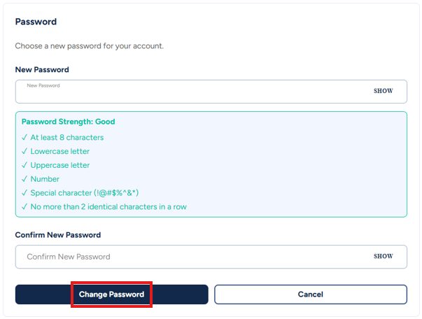 Should you need to change your password, this can be done by selecting the circle with your initials in the top right-hand corner.